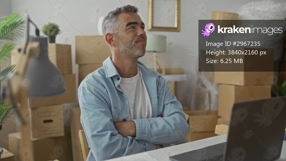 Man with arms crossed at desk beside laptop and stacked moving boxes in building; contentment settling.