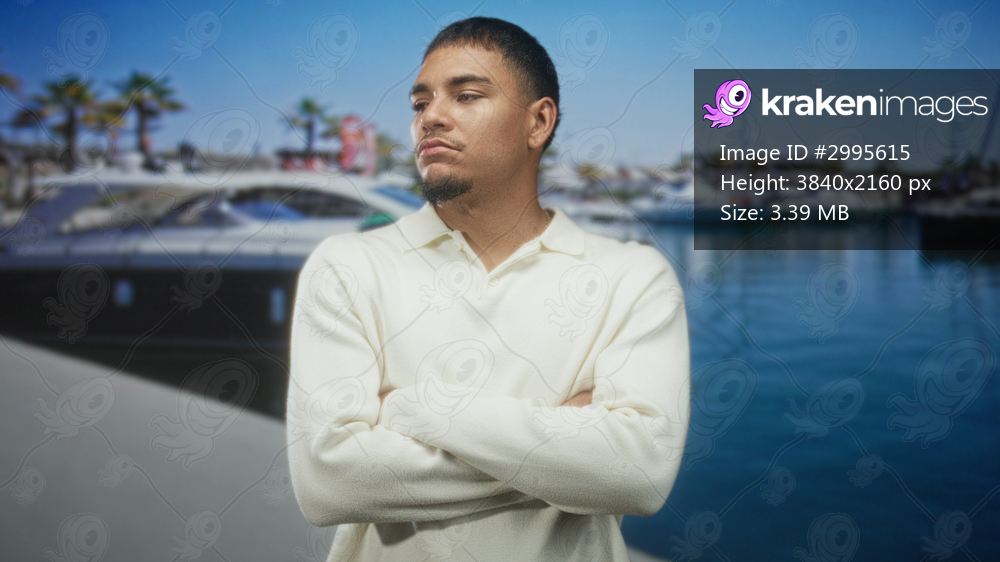 Man with arms crossed by a yacht at a marina, wearing a cream sweater and gold chain, looking stoic and slightly aloof; confidence.