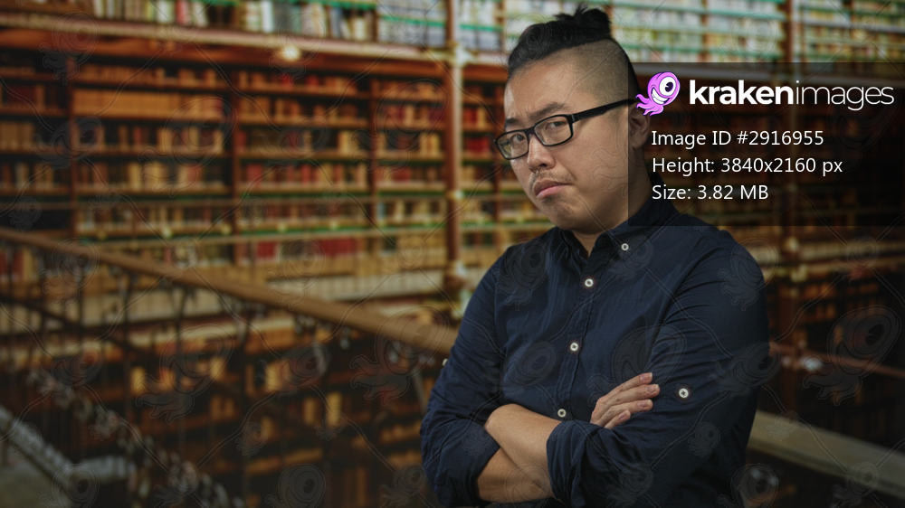 Man with arms crossed by tall wooden bookshelves in a library building, leaning on a railing and gazing at camera; confidence.