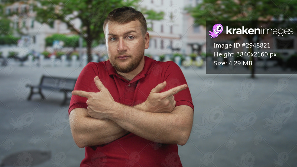Man with arms crossed, fingers pointing both ways, forearms visible, standing in an urban street plaza with bench and trees; indecision pause.