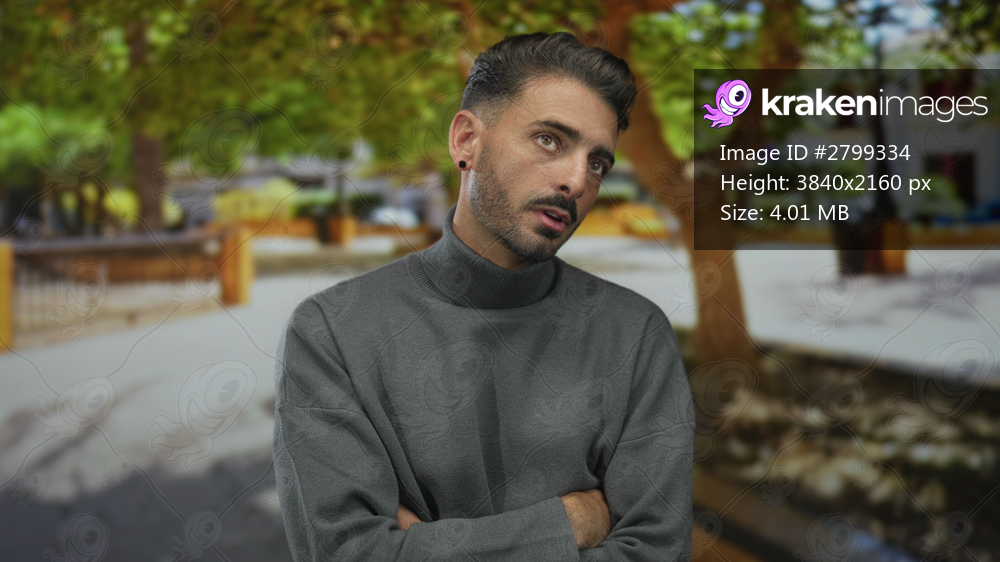 Man with arms crossed gazing downward on street under green trees and warm soft sunlight; contemplation.
