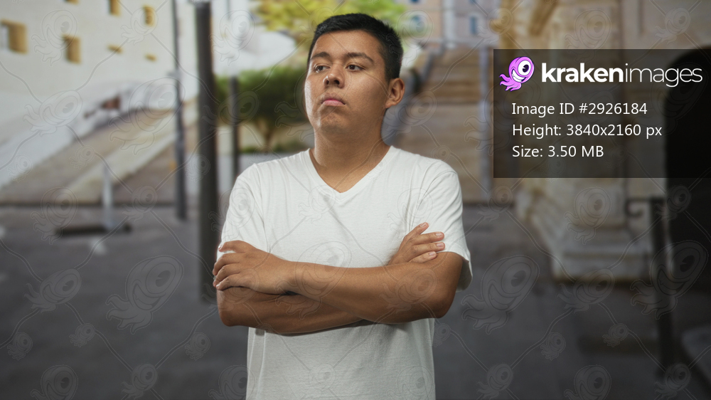 Man with arms crossed and hands visible standing on street near a stone building; confidence resilience.