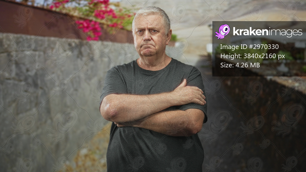 Man with arms crossed holding his upper arm on a stonewall lined street, tense frown and clenched grip visible; quiet resignation.