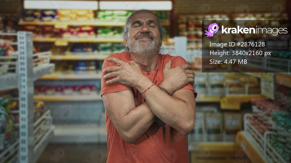 Man with arms crossed hugging his shoulders in a supermarket aisle while smiling with closed eyes; self love contentment.
