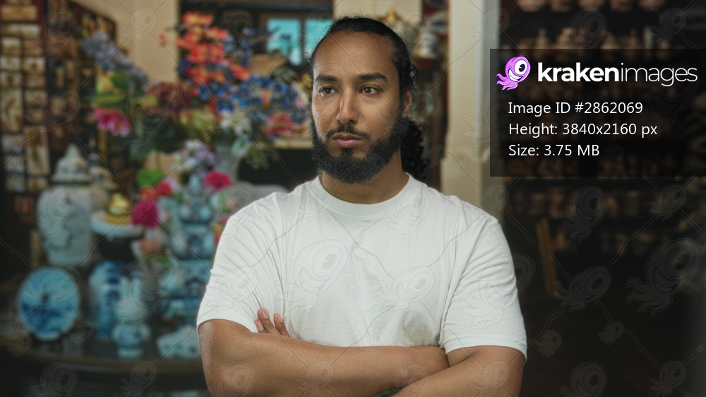 Man with arms crossed in a shop building wearing a white tshirt and beard showing folded forearms; quiet determination.