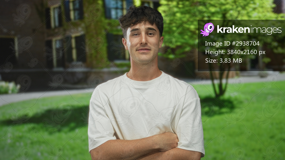 Man with arms crossed in front of brick building wearing white t shirt and looking at camera; confidence approachable.