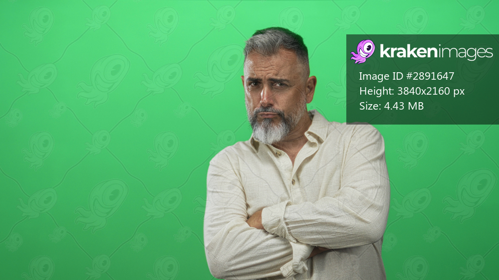 Man with arms crossed in studio against green screen, wearing a beige shirt and a skeptical frown; skepticism.