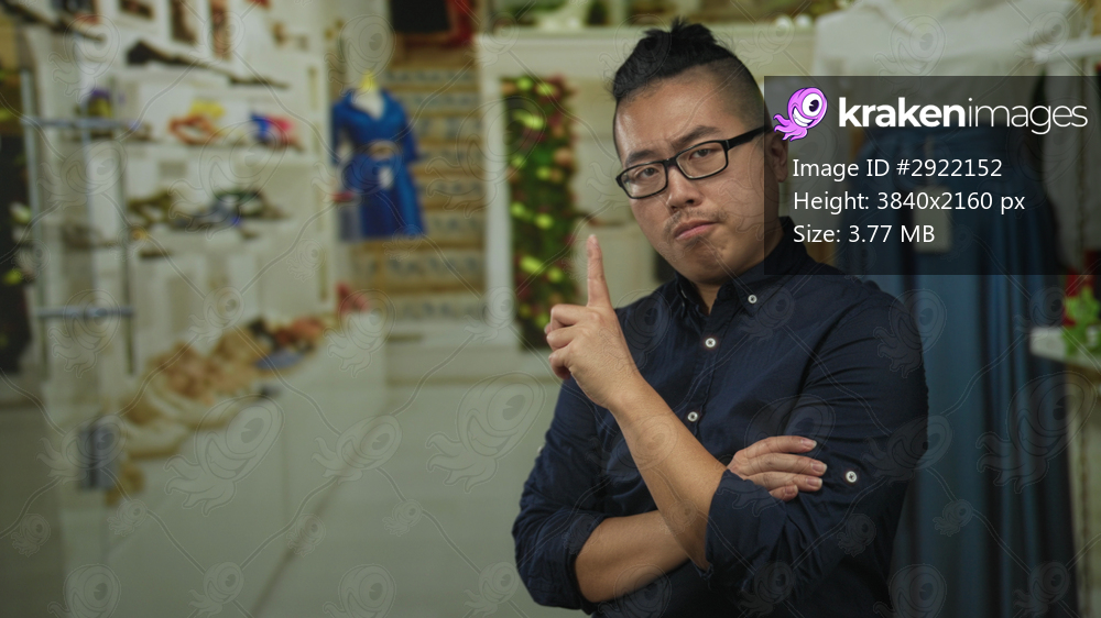 Man with arms crossed and index finger raised beside mannequins and shoe display in retail clothing store building; skepticism.