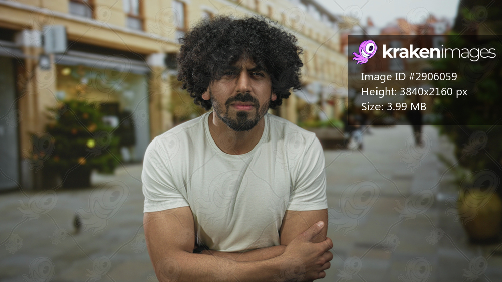 Man with arms crossed on a busy street wearing white t shirt and curly hair, forearms exposed and beard visible; defiance.