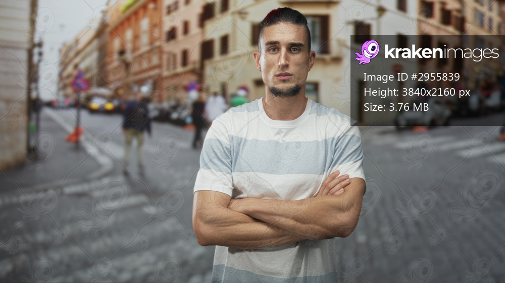 Man with arms crossed on a cobblestone street in urban downtown, striped shirt and goatee visible; confidence resilience.