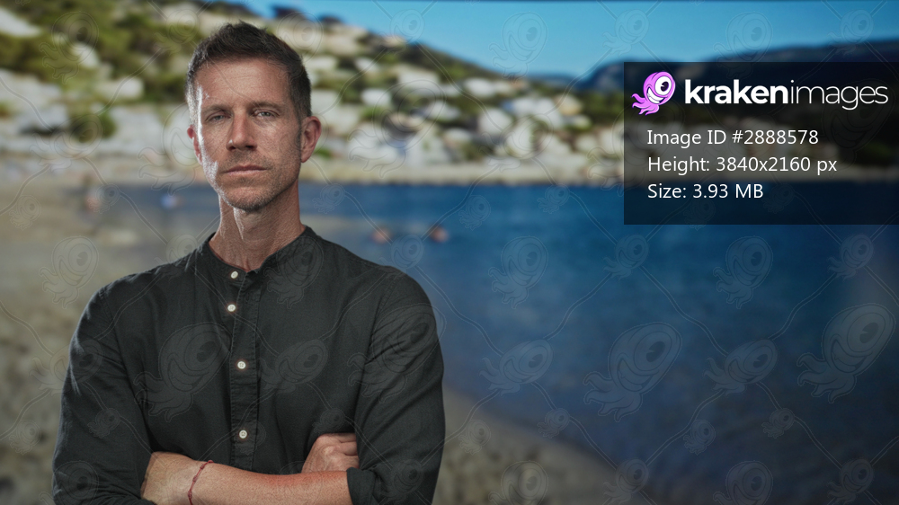 Man with arms crossed on a pebbled beach facing the camera, wearing dark shirt and bracelet; contemplative solitude.