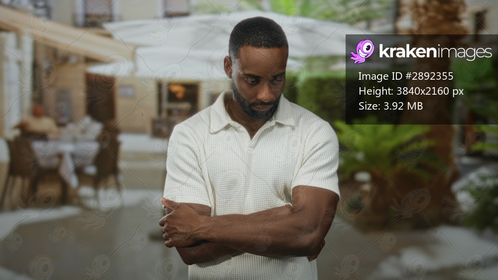 Man with arms crossed on a sunny restaurant terrace outdoors, wearing a white polo, gold chain and bracelet, looking down; contemplative reflection.