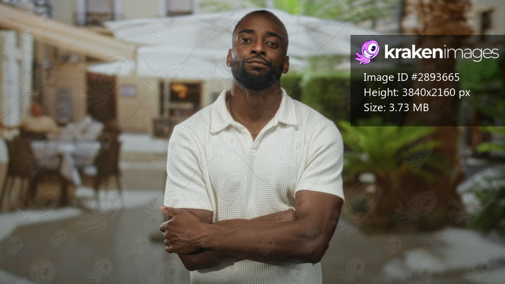 Man with arms crossed on a sunny restaurant terrace outdoors, wearing a white polo, gold chain and bracelet, looking down; contemplative reflection.