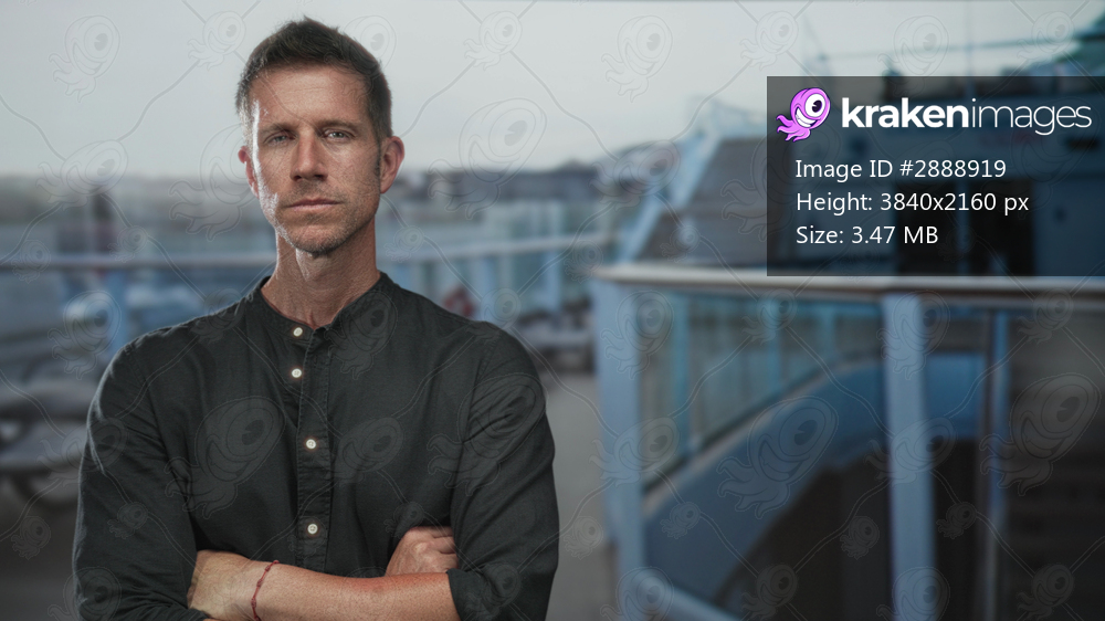 Man with arms crossed on cruise deck near glass railing, stern expression and folded forearms visible; quiet determination.