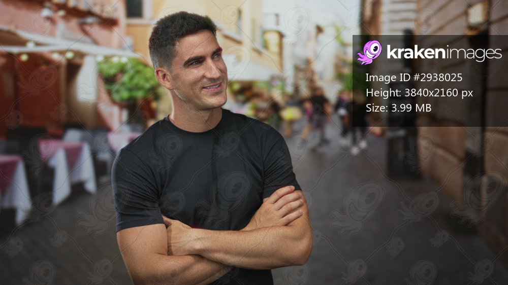 Man with arms crossed on street terrace outside restaurant, smiling and looking up; contentment casual confidence.