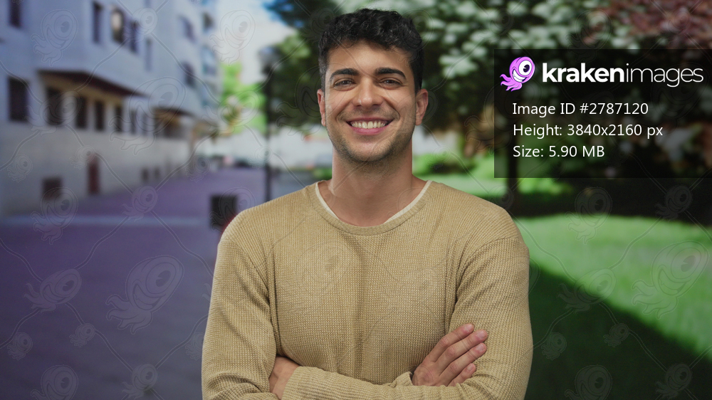 Man arms crossed outdoor scene shows male hands and hispanic young smile in casual portrait.