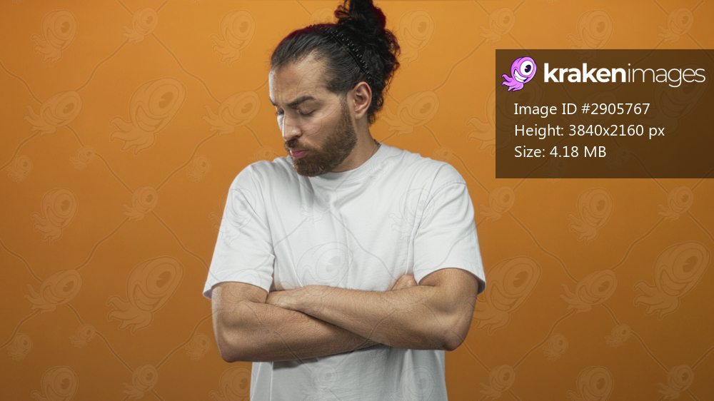 Man with arms crossed and pursed lips looking sideways in an orange studio wearing a white tshirt; defiance.