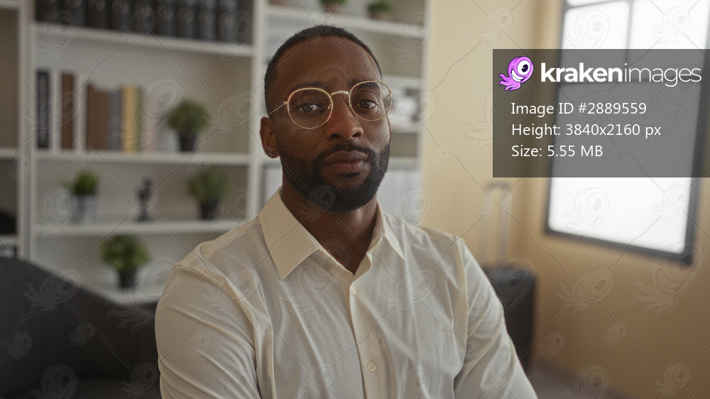 Man with arms crossed and round glasses seated on couch near bookshelf and suitcase in office building interior; quiet confidence.