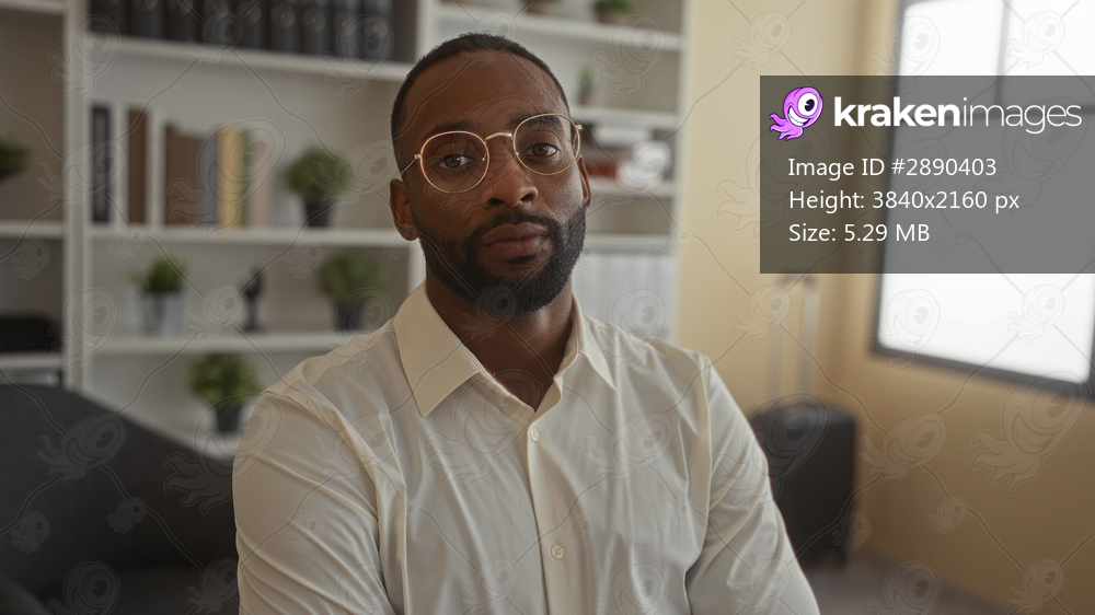 Man with arms crossed and round glasses seated on couch near bookshelf and suitcase in office building interior; quiet confidence.