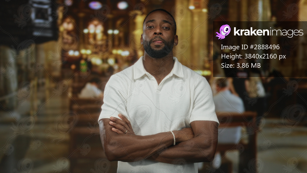 Man with arms crossed showing forearms and a bracelet in an ornate catholic church building, pews and chandeliers visible; quiet contemplation.