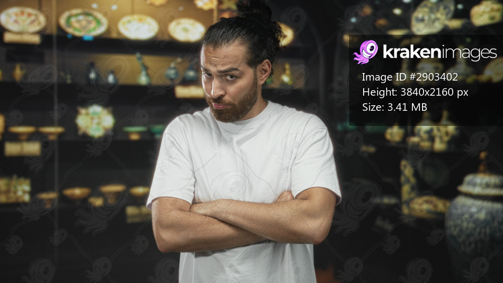Man with arms crossed showing forearms in museum gallery wearing white tshirt and beard; skepticism curiosity doubt.