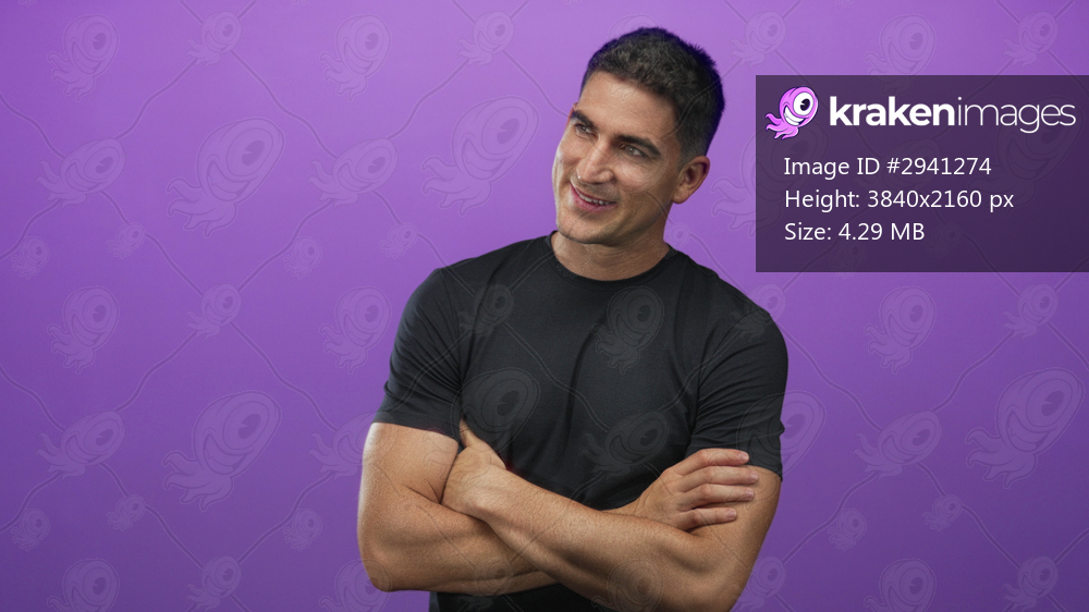 Man with arms crossed smiling in purple studio, looking off to the right with casual posture; confidence.