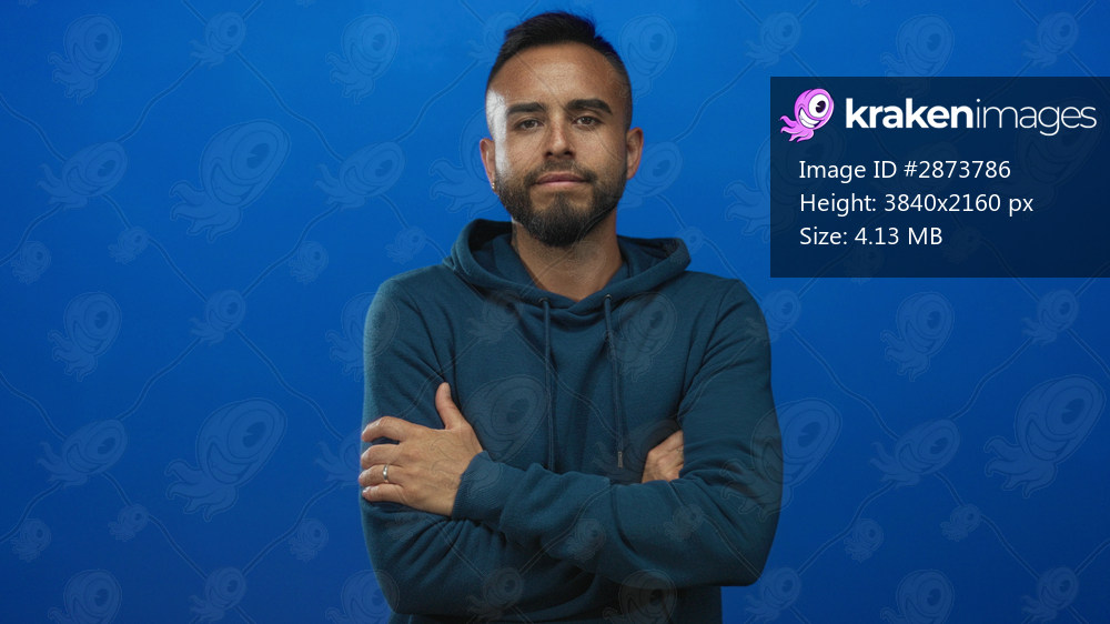 Man with arms crossed and visible rings wearing teal hoodie and beard facing camera in a studio with vivid blue backdrop; confidence ease.