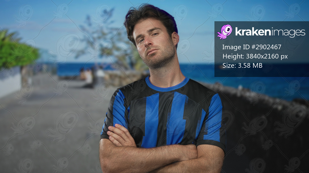 Man with arms crossed wearing a blue soccer jersey on a seaside promenade, hands visible and crossed posture; confidence resilience.