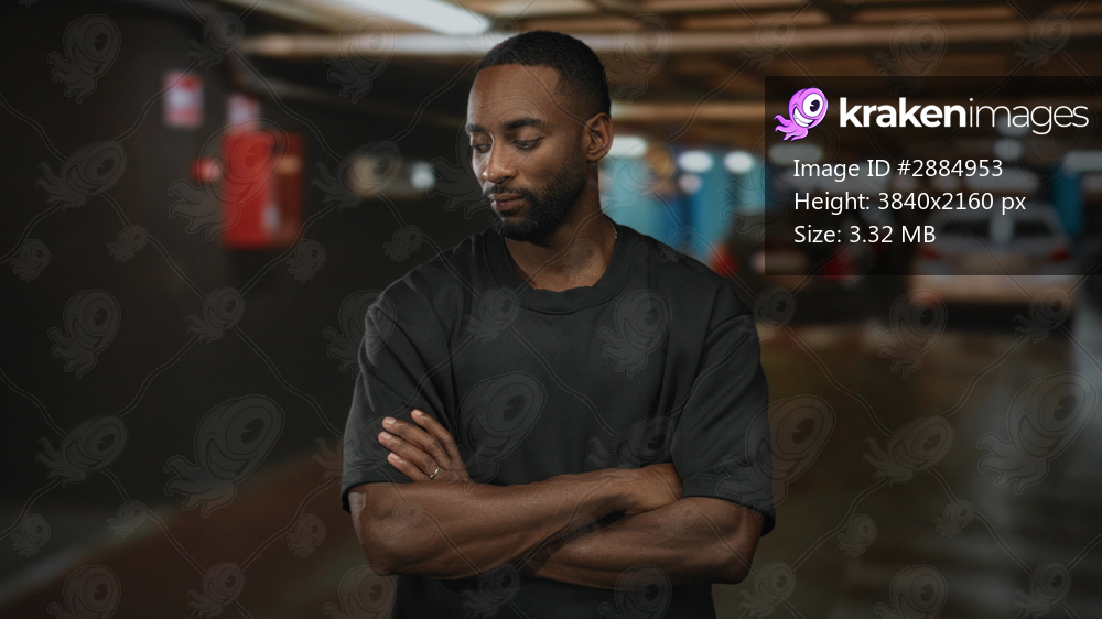 Man with arms crossed wearing black shirt in parking building, standing among parked cars with neutral gaze; confidence.