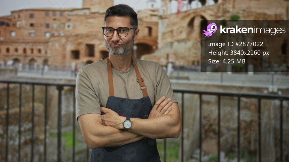 Man with arms crossed wearing denim apron at building ruins by ancient stone walls smiling to camera; confidence craft.