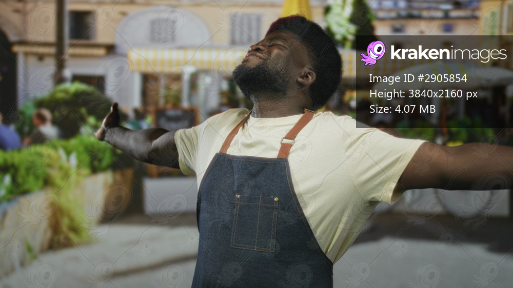 Man with arms outstretched and head tilted back wearing denim apron on street cafe terrace, smiling broadly; joy hospitality.