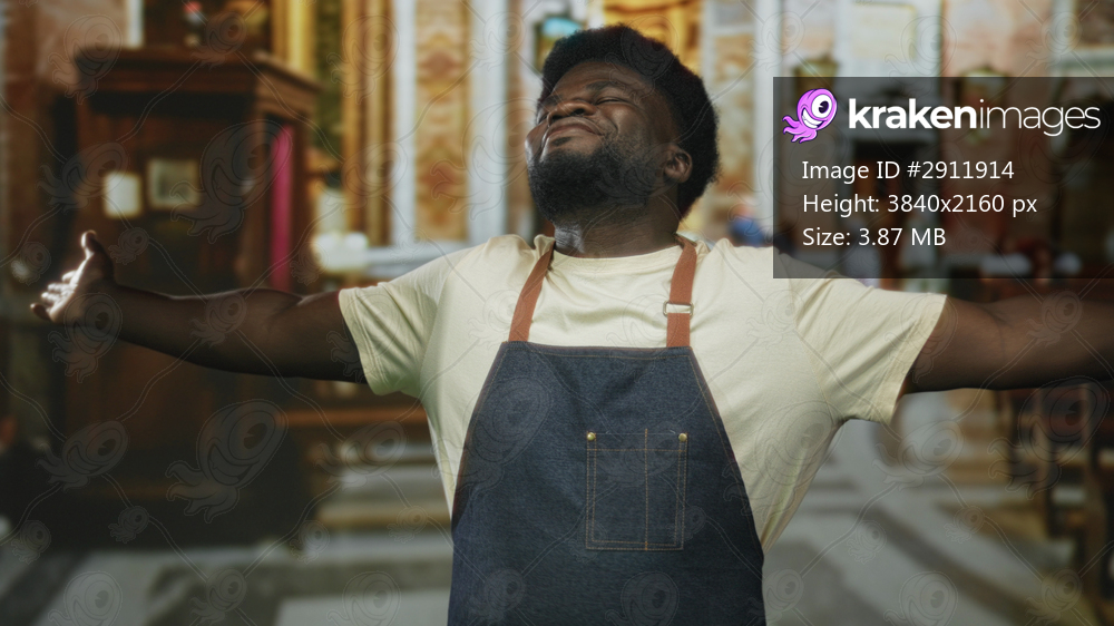 Man with arms outstretched in church, wearing denim apron and cream t shirt, head tilted upward and eyes closed; faith gratitude joy.