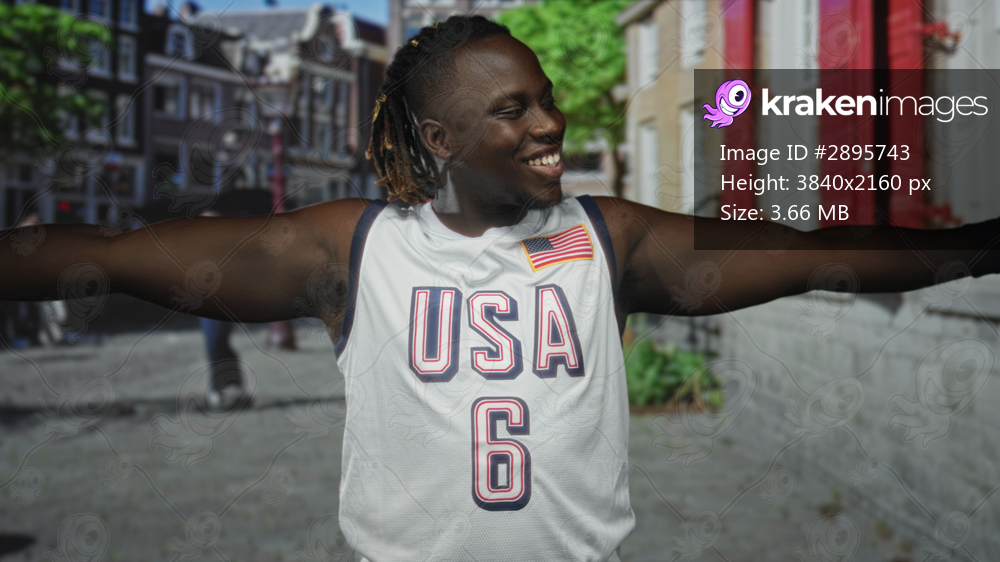 Man with arms outstretched smiling on a city street wearing a usa jersey with flag patch; joy celebration.