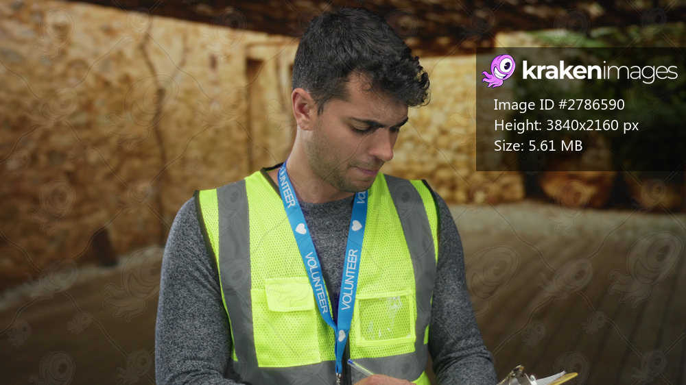 Man arranges clipboard layouts before writing reports in a courtyard for volunteer crews with a hispanic and young assistant in vest and a pen held by a keen guy. - Kraken Images