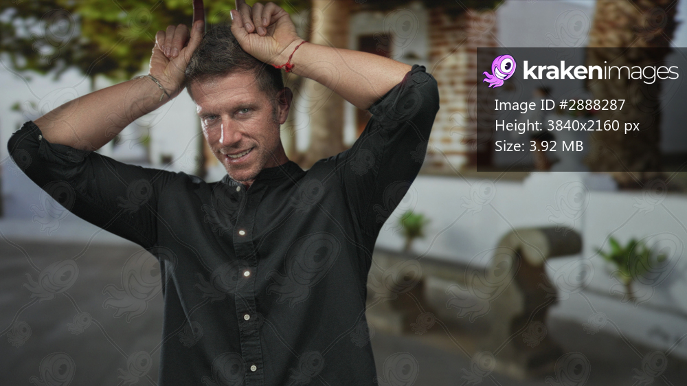 Man at a white building entrance, hands raised to head making horn gesture, shirt sleeves rolled, facing camera with visible face and forearms; mischief relaxed. - Kraken Images