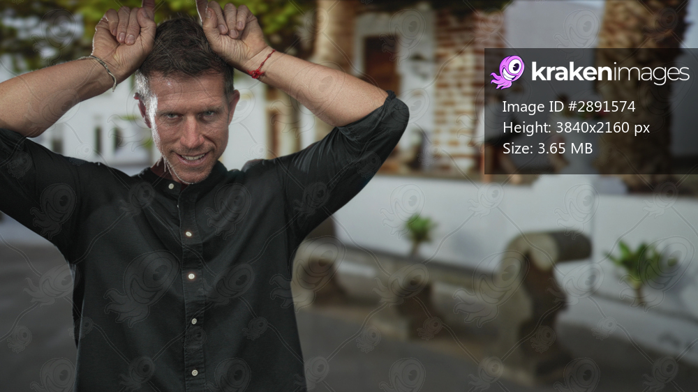 Man at a white building entrance, hands raised to head making horn gesture, shirt sleeves rolled, facing camera with visible face and forearms; mischief relaxed. - Kraken Images