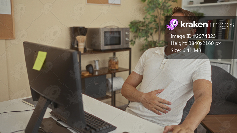 Man at computer clutching stomach with hand while seated at desk in office building; workplace discomfort.