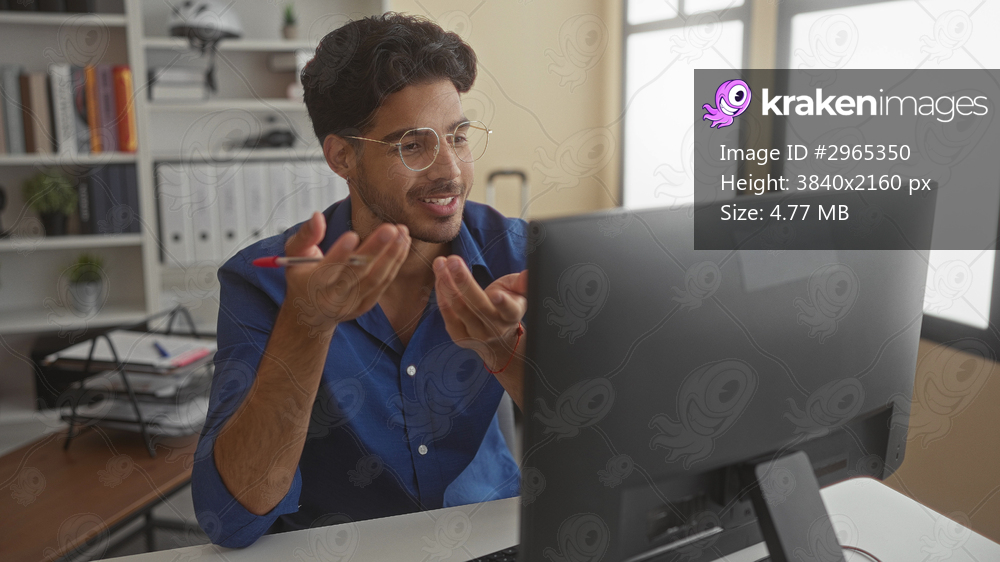 Man at computer gesturing with hands during a video call in an office building; thoughtful interaction.