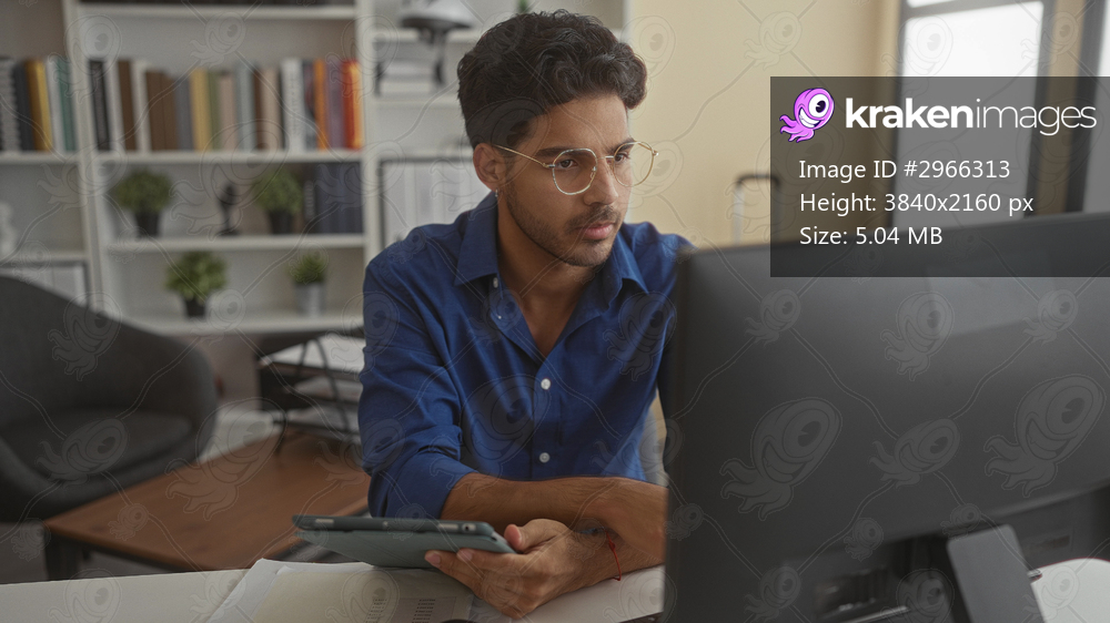 Man at desk using tablet with stylus, right hand writing while looking at computer monitor in studio; concentration productivity.