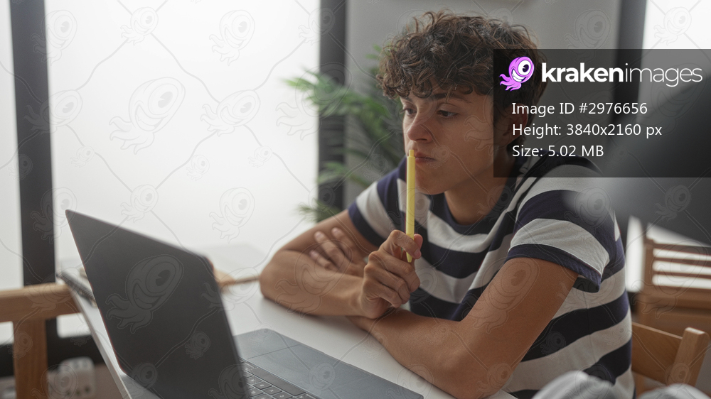 Man at laptop holding yellow highlighter to lips, studying at a building desk with notebooks and window light; thoughtful quiet concentration focus.