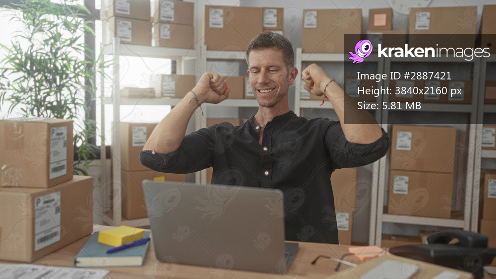 Man at laptop raising fists amid stacked parcels on shelves in an office building; small business success.
