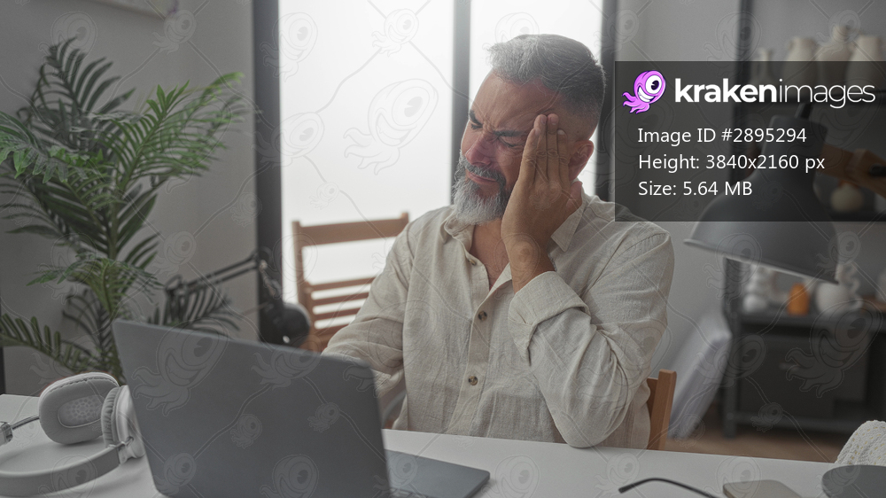 Man at laptop rubbing eyes with hand on face while seated at desk near lamp, plant and headphones in studio; work fatigue.