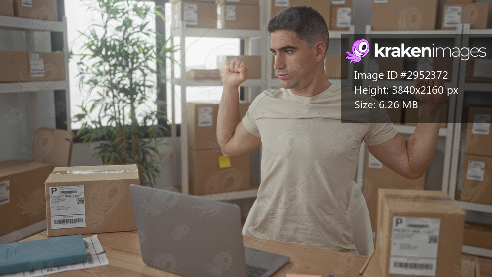 Man at packing desk with parcels and laptop in office stretches arms behind head; relief productivity.
