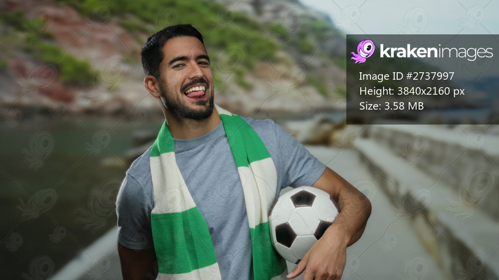 Man at seaside posing playfully with soccer ball wearing scarf against scenic coastline backdrop.