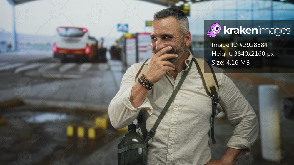 Man with backpack, hand to mouth smiling at airport terminal curb near bus stop; travel adventure amused.