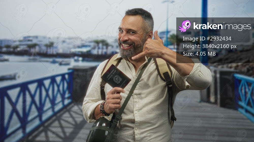 Man with backpack holding passport and smiling while making call me hand gesture to ear on street by seaside pier with boats; adventure.