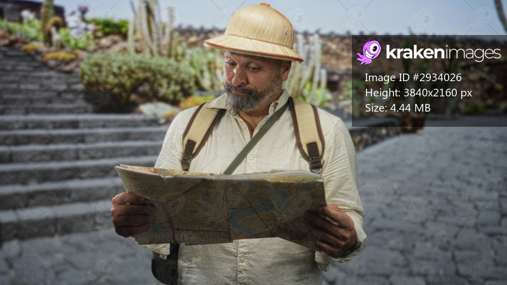 Man with backpack and pith helmet holding map on stone street steps near cactus garden; adventure travel curiosity.