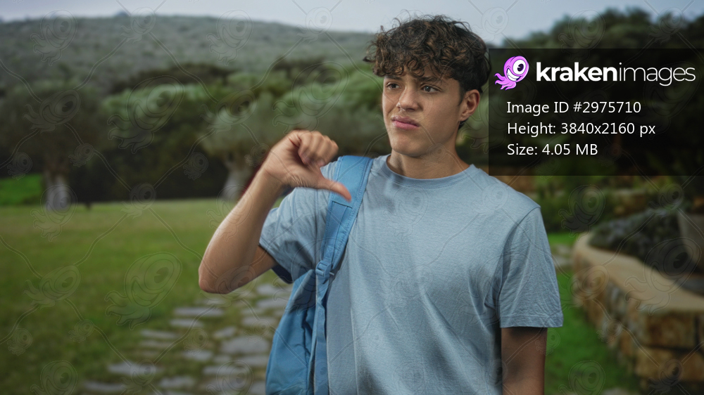 Man with backpack shows thumbs down gesture on forest path, also pointing in other frames; disapproval reluctance.