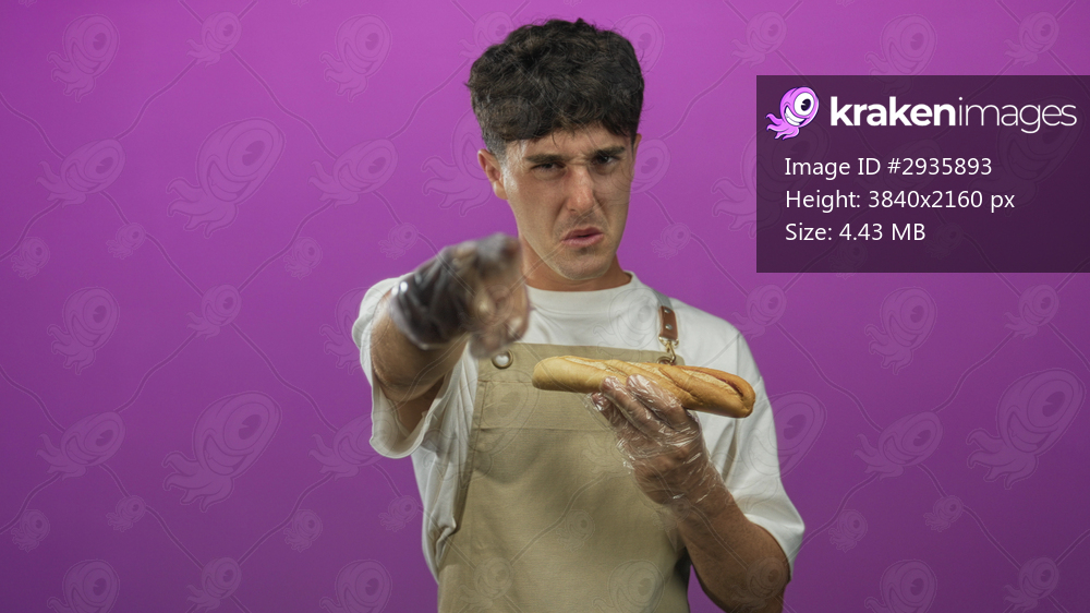 Man baker wearing apron and gloves holding baguette and pointing finger in purple studio; disgust hygiene.
