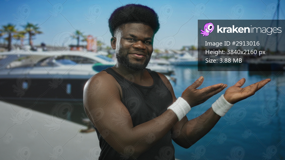 Man with bare arms and hands open palms up at a port marina, smiling beside boats and pier; playful invitation.
